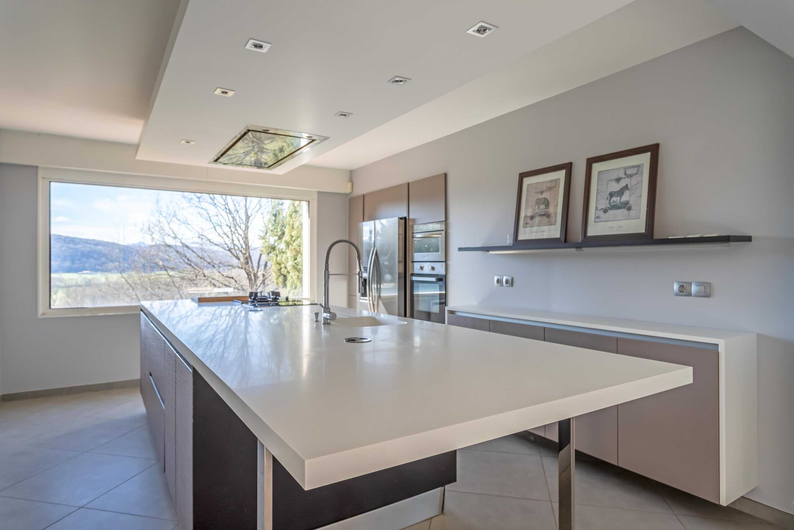 At the heart of the home lies an impressive open-plan living area featuring a sleek contemporary kitchen with integrated appliances and clean modern lines. The sitting area, complete with an insert log-burning stove, provides warmth and atmosphere, while glass doors open seamlessly onto the terrace — perfect for relaxed entertaining against that extraordinary mountain backdrop. Tiled flooring throughout keeps the look crisp and cohesive.