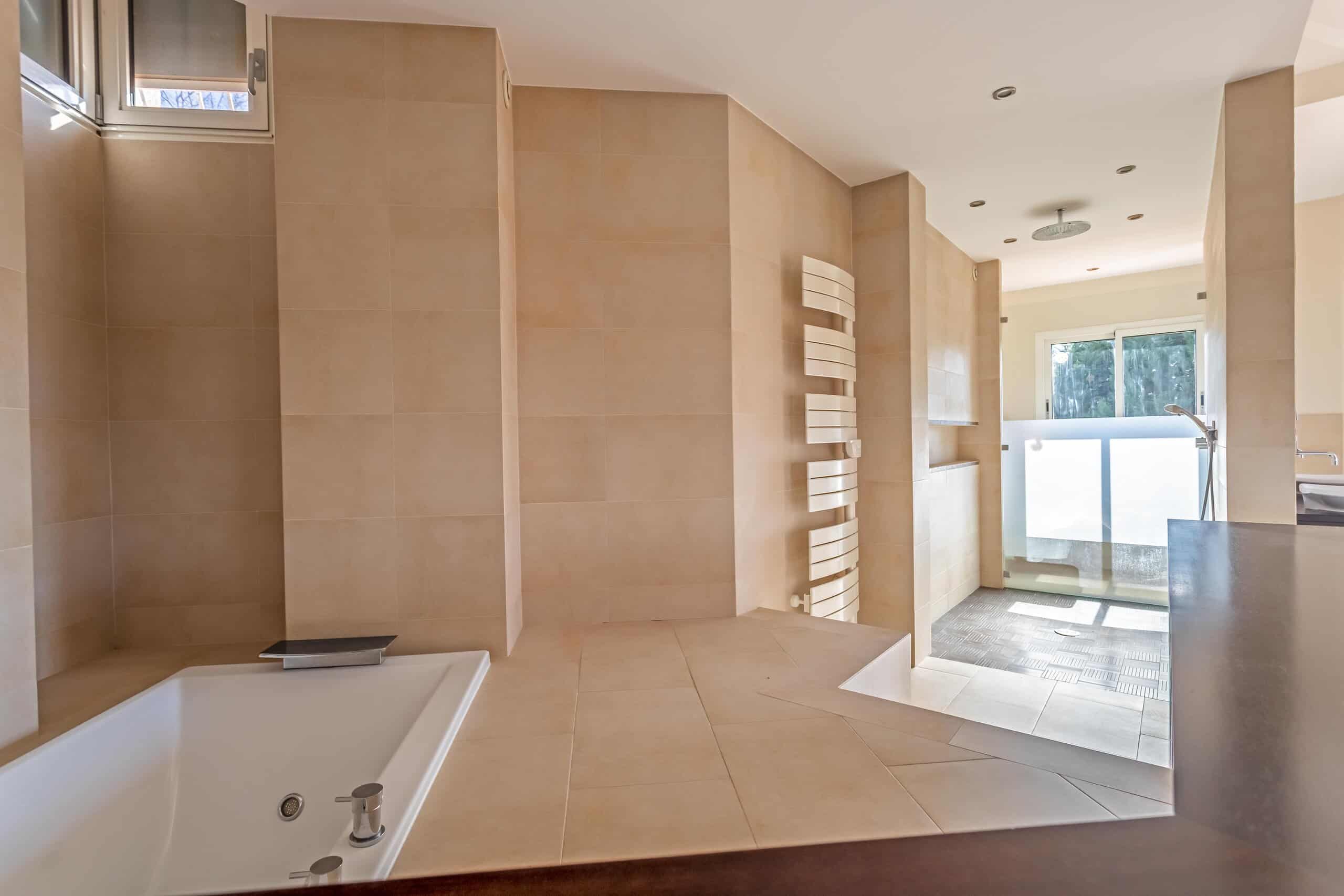 Here, a luxurious master suite offers a boutique-hotel feel, with an open-plan bedroom flowing into a spa-inspired bathroom featuring a sunken bath, generous walk-in shower with breathtaking views, and a fully fitted walk-in dressing room. Glass doors open onto a private roof terrace where the Pyrenees take centre stage.