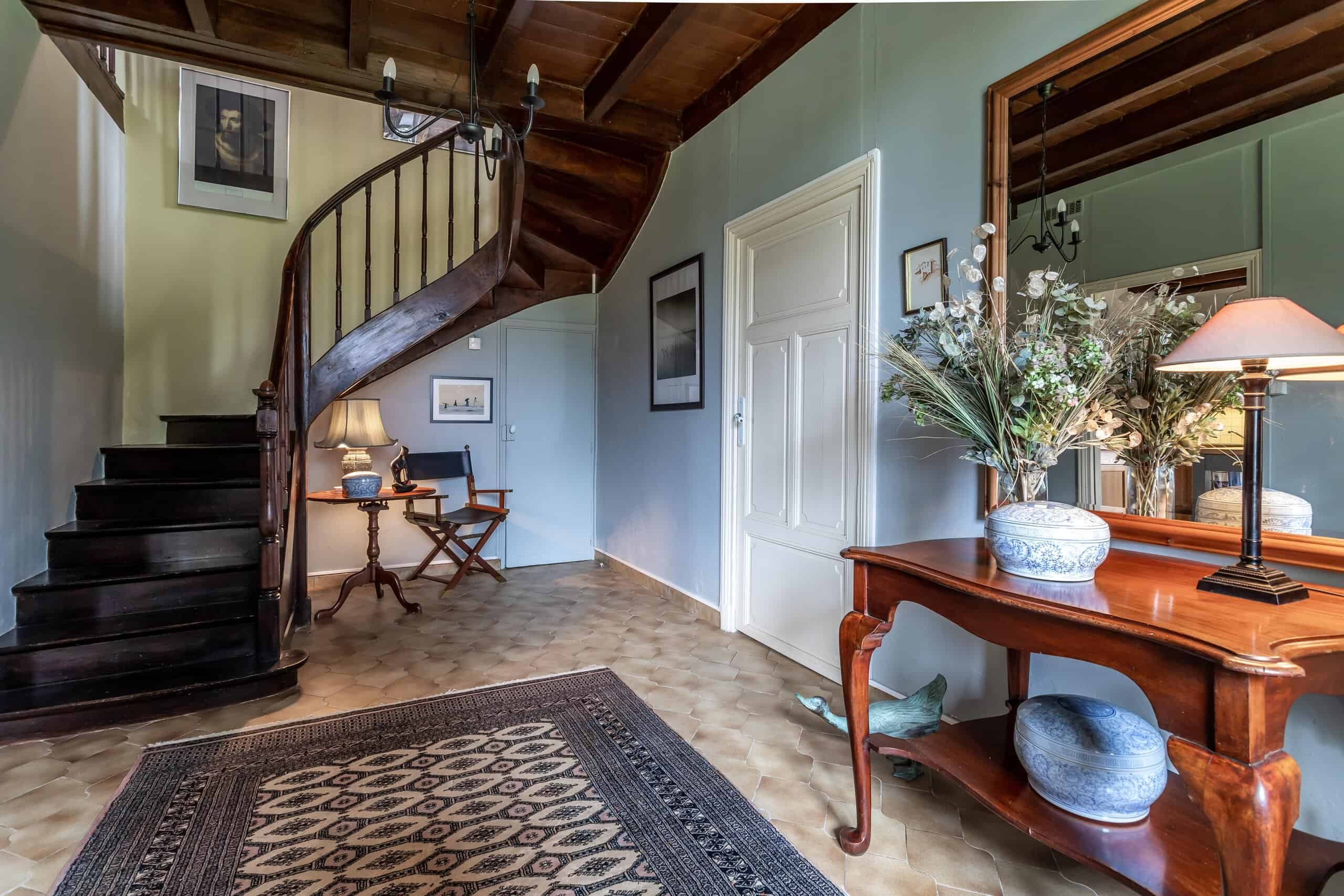 The principal house is rich in character, with a gracious entrance hall showcasing its original 19th-century staircase — an immediate sense of history and proportion.