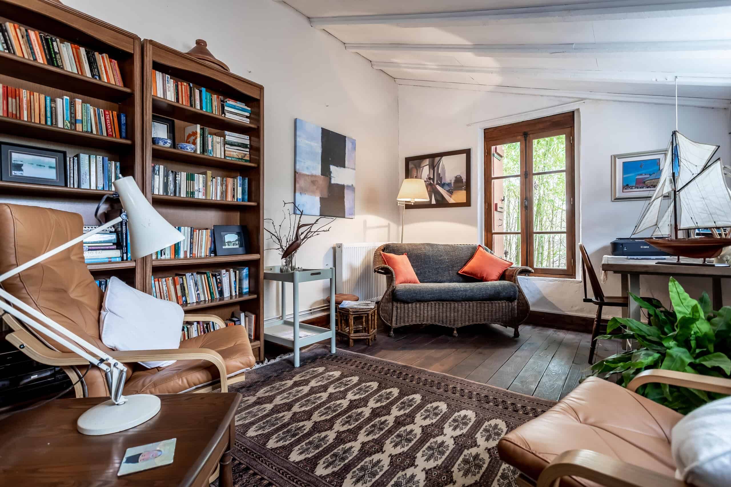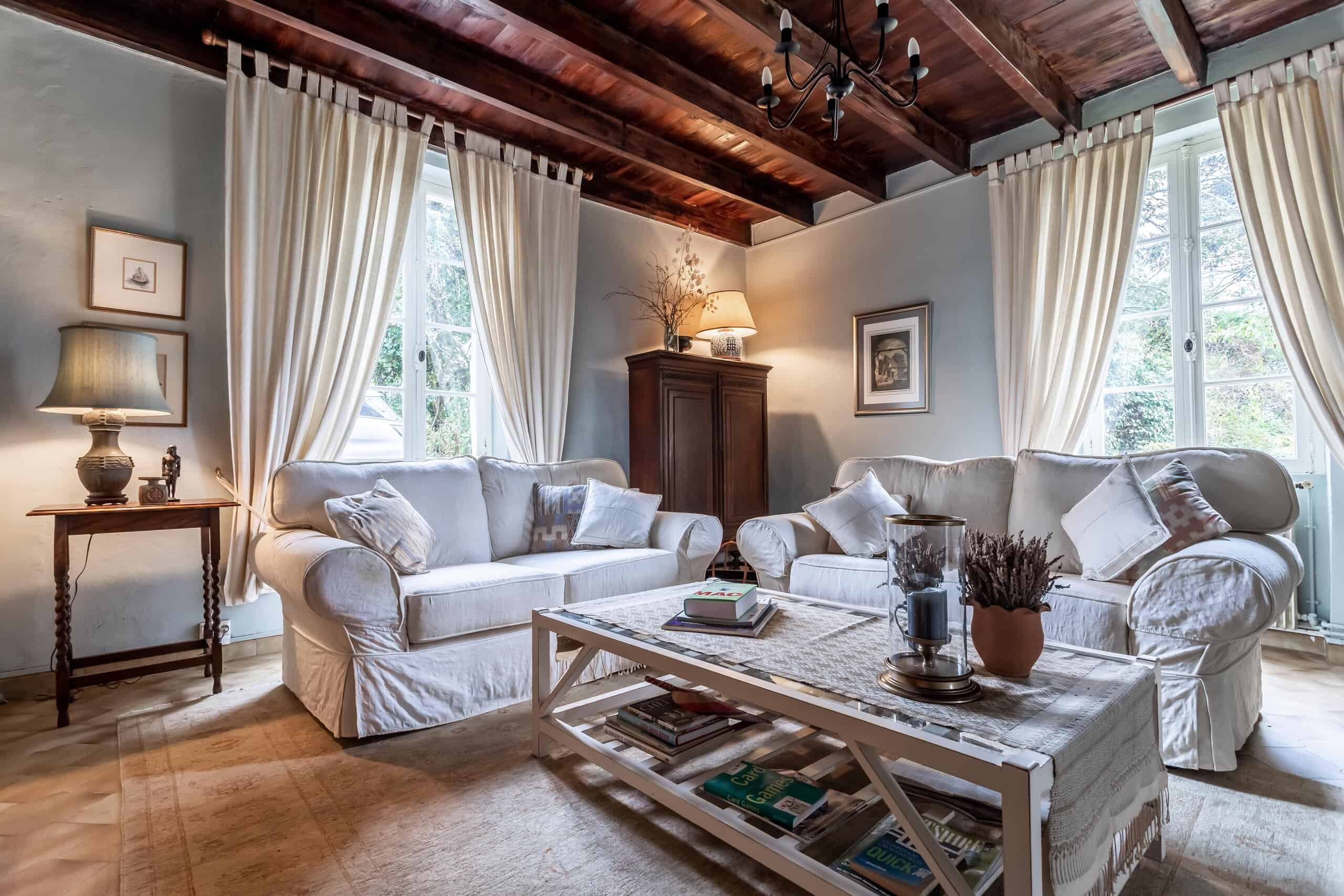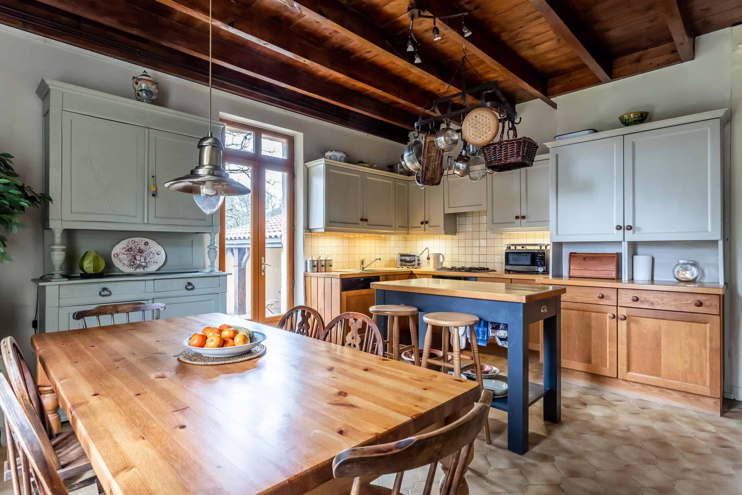 A welcoming country kitchen opens through French doors onto a terrace and connects seamlessly to a covered outdoor dining area, ideal for apéritifs as the day winds down. The sitting room is warm and inviting, featuring an open fireplace, exposed beams and fitted cupboards.
