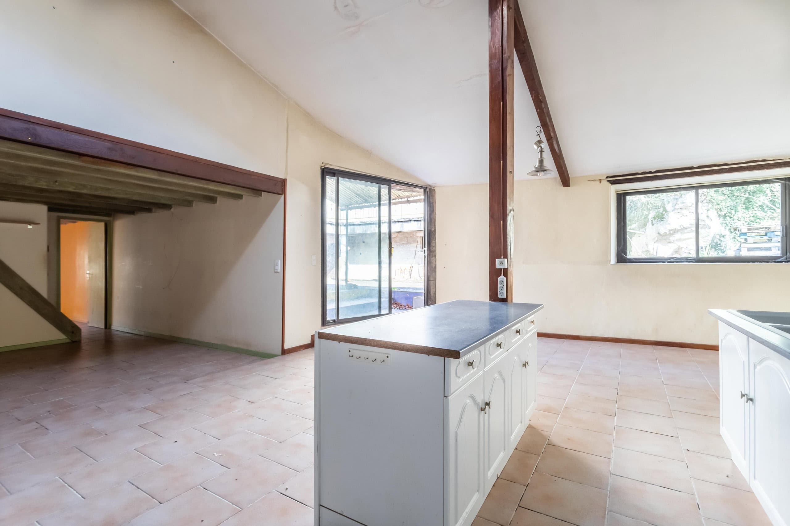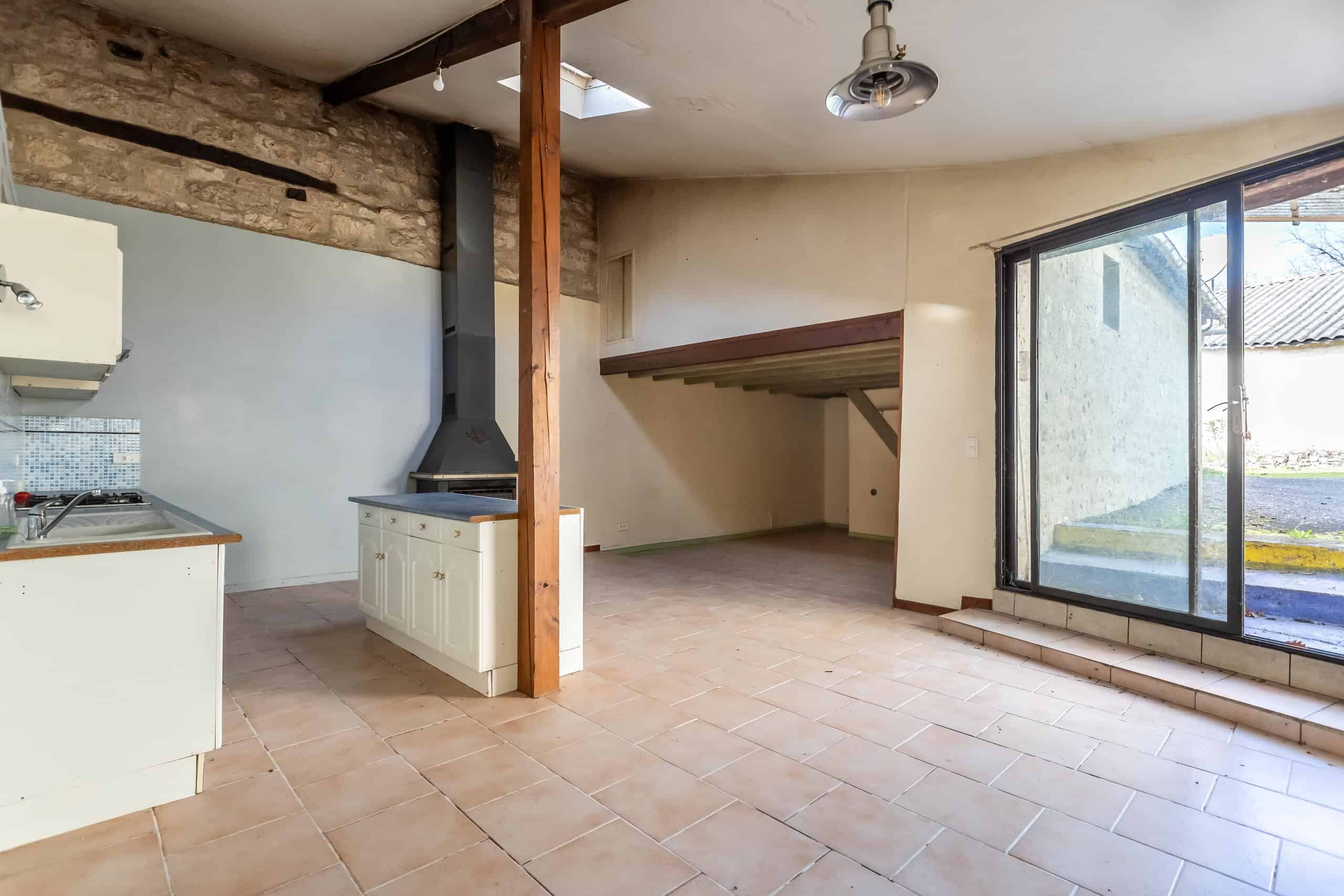 Small 19th century, stone village house situated in the centre of a sleepy hamlet a few minutes’ drive to Montcuq, comprising a three bedroom property with a large open plan living space with and kitchen, tiled flooring, log burning stove and double glazing, presented in good structural condition but requiring some updating.