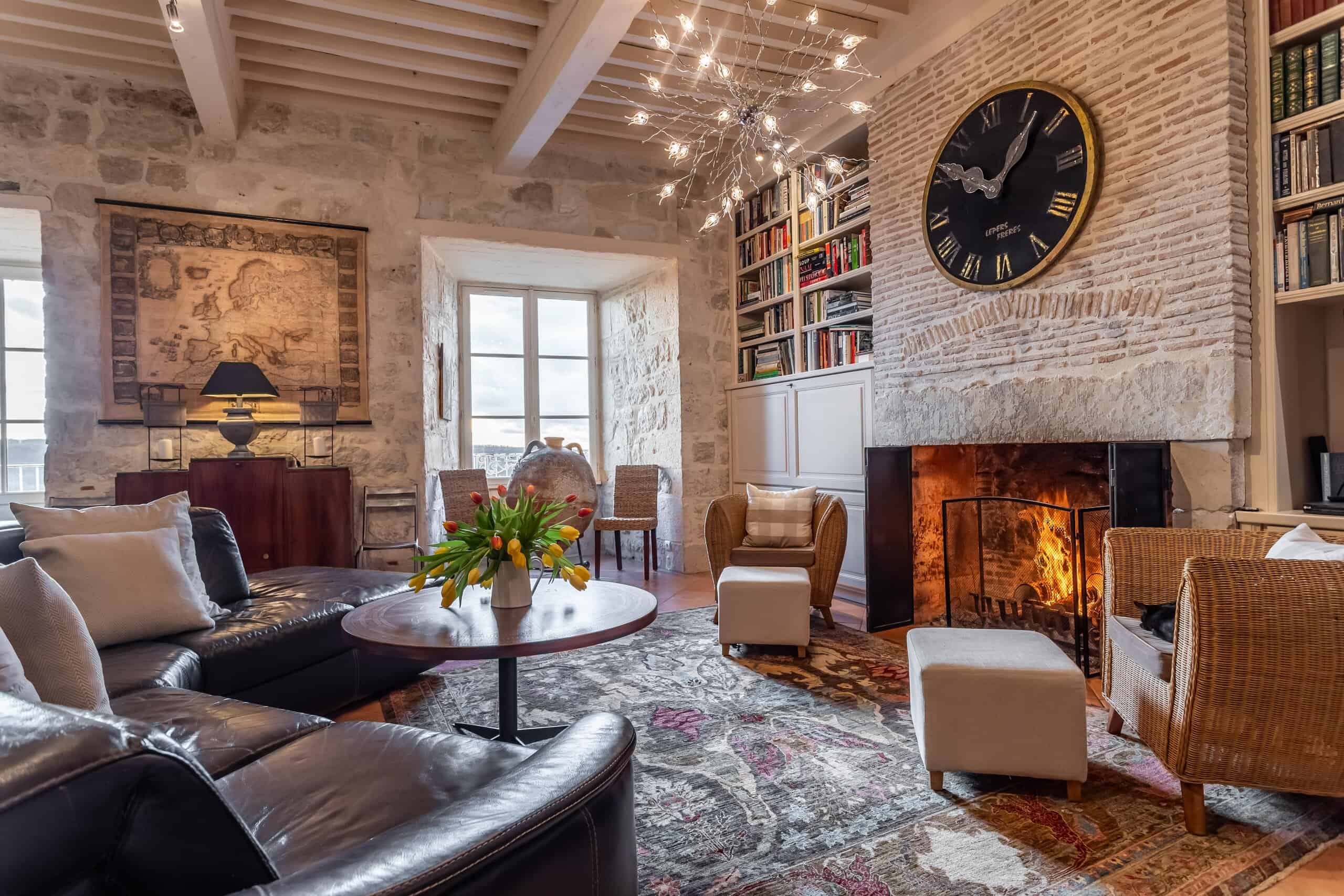 Period features abound: elegant 15th century stone archways, exposed beams and ancient fireplaces sit happily alongside chic contemporary touches. The ground floor is arranged as a large open-plan living space, complete with bespoke built-in bookcases and bureau, flowing seamlessly into a modern kitchen with integrated appliances, utility with downstairs loo. A cosy sitting room with a fabulous fireplace opens directly onto the balcony, making it equally perfect for winter evenings or summer entertaining.