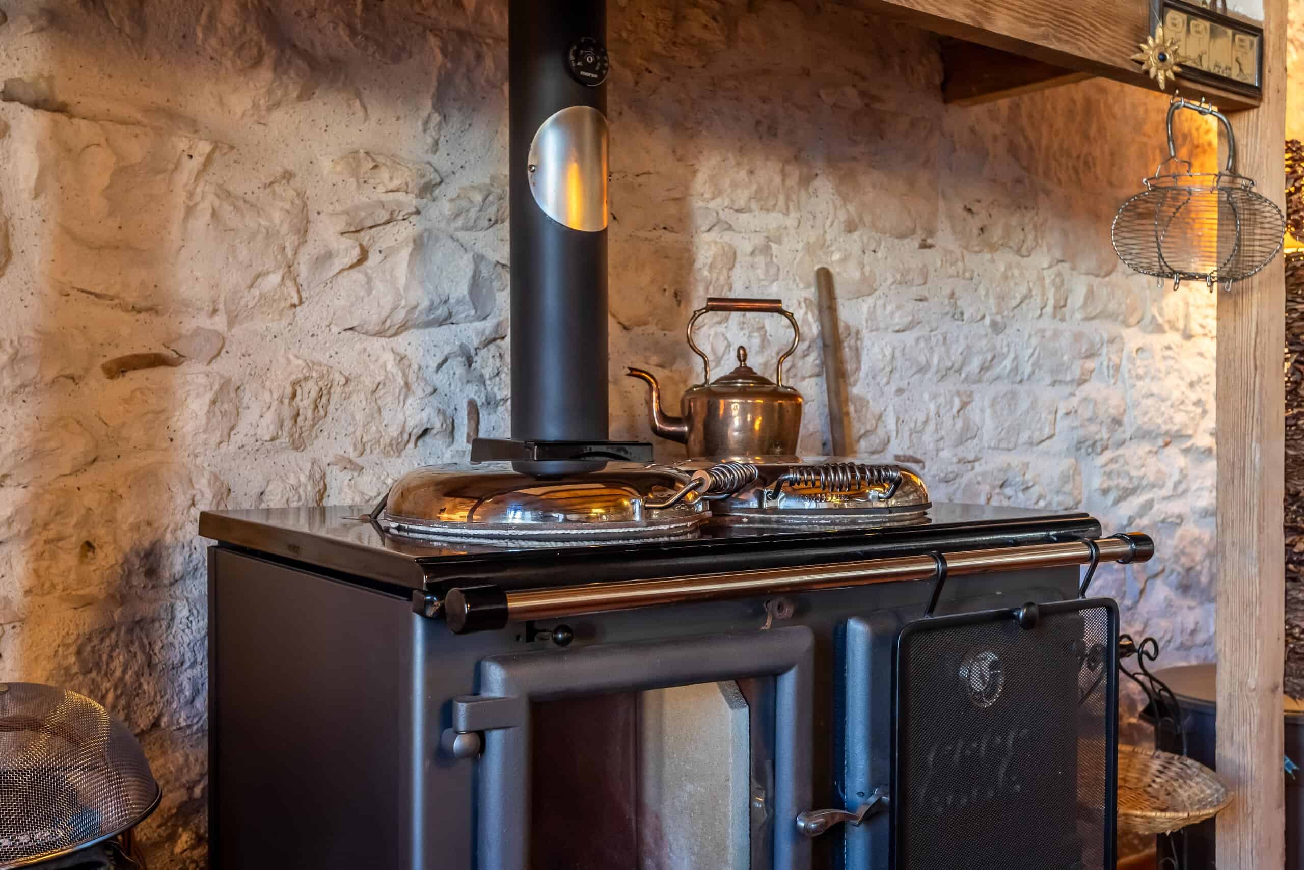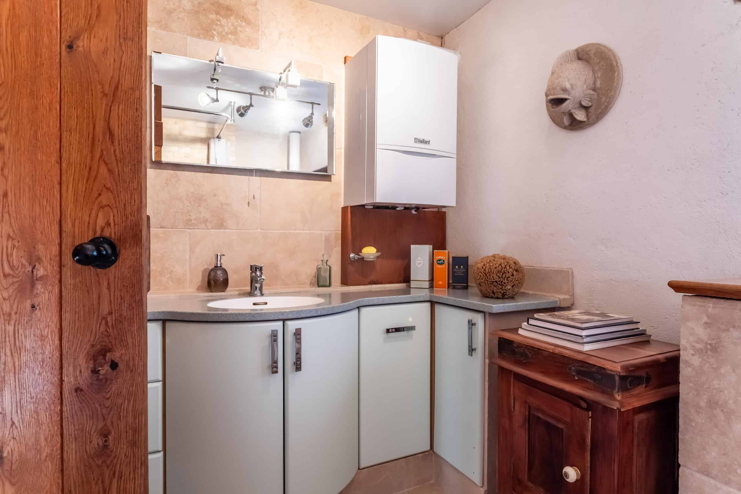 An ancient staircase leads to the first floor, where you’ll find a second sitting room (ideal for quieter contemplation or louder teenagers), a useful storage room, a marble fireplace, and fabulous original floorboards. The principal bedroom is a delight, complete with ancient floorboards, a multi-fuel burning stove, and its own luxurious en-suite bathroom lined in travertine, with roll-top bath, shower, and wonderful views that make mornings feel unnecessarily cinematic.